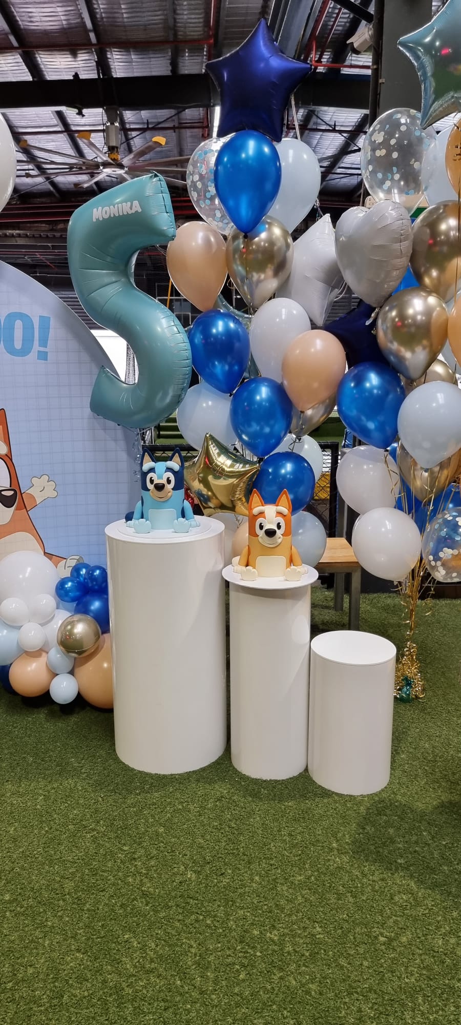 Host your child's dream birthday in a Bluey & Bingo theme with a balloon garland, personalised numbers, cake plinths and balloon bouquets for all!